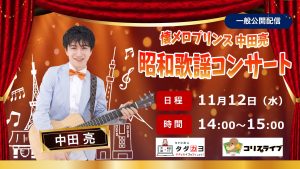9/19(木)無料オンラインコンサート出演決定!! 2024 8/14 news 2024/08/14 コリスライブ×タダカヨのコラボ開催の「昭和歌謡コンサート」への出演が9月も決定いたしました!今回も参加費は無料です!下記ページよりお申し込みください! お申し込みページ news よかったらシェアしてね! URLをコピーしました! URLをコピーしました! 中田亮公式新グッツデザイン公開! 2nd Mini Album 「LOVE」発売決定!! この記事を書いた人 naoya 関連記事 [中田亮×マツココ]特別無料番組開催決定!!!! 2025/11/12 11/12(水)無料オンラインコンサート出演決定!! 2025/11/03 2025年11月演奏可能リスト更新! 2025/10/31 9/30(火)テレビ朝日「ワイド!スクランブル」に取り上げられます。 2025/09/29 10/24(金)無料オンラインコンサート出演決定!! 2025/09/16 旅介TVにて大阪・関西万博のリポーター決定! 2025/09/08 鈴木早智子さん(Wink)ラジオ番組にゲスト出演決定! 2025/08/13 8/19(火)無料オンラインコンサート出演決定!! 2025/07/29 コメント コメントする コメントをキャンセルコメント ※ 名前 ※ メール ※ サイト 次回のコメントで使用するためブラウザーに自分の名前、メールアドレス、サイトを保存する。