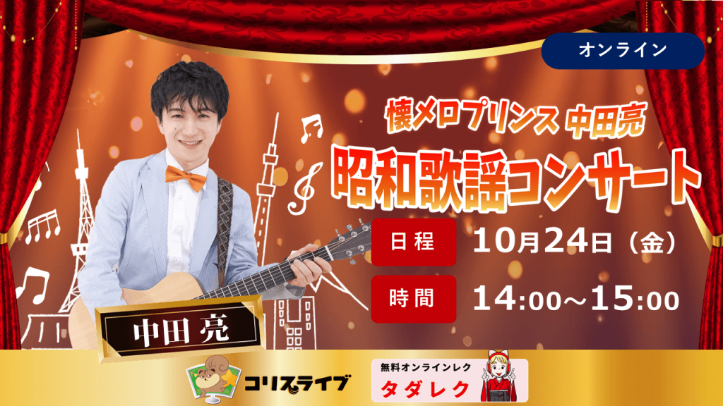 10/24(金)無料オンラインコンサート出演決定!! 2025 9/16 news 2025/09/16 コリスライブ×タダカヨのコラボ開催の「昭和歌謡コンサート」への出演が決定いたしました!今回も参加費は無料です!下記ページよりお申し込みください! お申し込みページ news よかったらシェアしてね! URLをコピーしました! URLをコピーしました! 旅介TVにて大阪・関西万博のリポーター決定! 2025年10月演奏可能リスト更新! この記事を書いた人 naoya 関連記事 9/30(火)テレビ朝日「ワイド!スクランブル」に取り上げられます。 2025/09/29 2025年10月演奏可能リスト更新! 2025/09/29 旅介TVにて大阪・関西万博のリポーター決定! 2025/09/08 鈴木早智子さん(Wink)ラジオ番組にゲスト出演決定! 2025/08/13 8/19(火)無料オンラインコンサート出演決定!! 2025/07/29 旅介TVにて大阪・関西万博のリポーター決定! 2025/07/01 7/25(金)無料オンラインコンサート出演決定!! 2025/06/30 6/30(月)無料オンラインコンサート出演決定!! 2025/05/21 コメント コメントする コメントをキャンセルコメント ※ 名前 ※ メール ※ サイト 次回のコメントで使用するためブラウザーに自分の名前、メールアドレス、サイトを保存する。