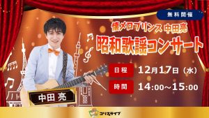 10/24(金)無料オンラインコンサート出演決定!! 2025 9/16 news 2025/09/16 コリスライブ×タダカヨのコラボ開催の「昭和歌謡コンサート」への出演が決定いたしました!今回も参加費は無料です!下記ページよりお申し込みください! お申し込みページ news よかったらシェアしてね! URLをコピーしました! URLをコピーしました! 旅介TVにて大阪・関西万博のリポーター決定! 9/30(火)テレビ朝日「ワイド!スクランブル」に取り上げられます。 この記事を書いた人 naoya 関連記事 12/17(水)無料オンラインコンサート出演決定!! 2025/12/05 [中田亮×マツココ]特別無料番組開催決定!!!! 2025/12/02 2025年12月演奏可能リスト更新! 2025/12/02 11/24(月)オレンジ音楽祭inあしかが2025出演決定! 2025/11/04 11/12(水)無料オンラインコンサート出演決定!! 2025/11/03 11/8(土)宇都宮ライトキューブ「介護の日フェスティバル」に出演決定! 2025/11/01 9/30(火)テレビ朝日「ワイド!スクランブル」に取り上げられます。 2025/09/29 旅介TVにて大阪・関西万博のリポーター決定! 2025/09/08 コメント コメントする コメントをキャンセルコメント ※ 名前 ※ メール ※ サイト 次回のコメントで使用するためブラウザーに自分の名前、メールアドレス、サイトを保存する。