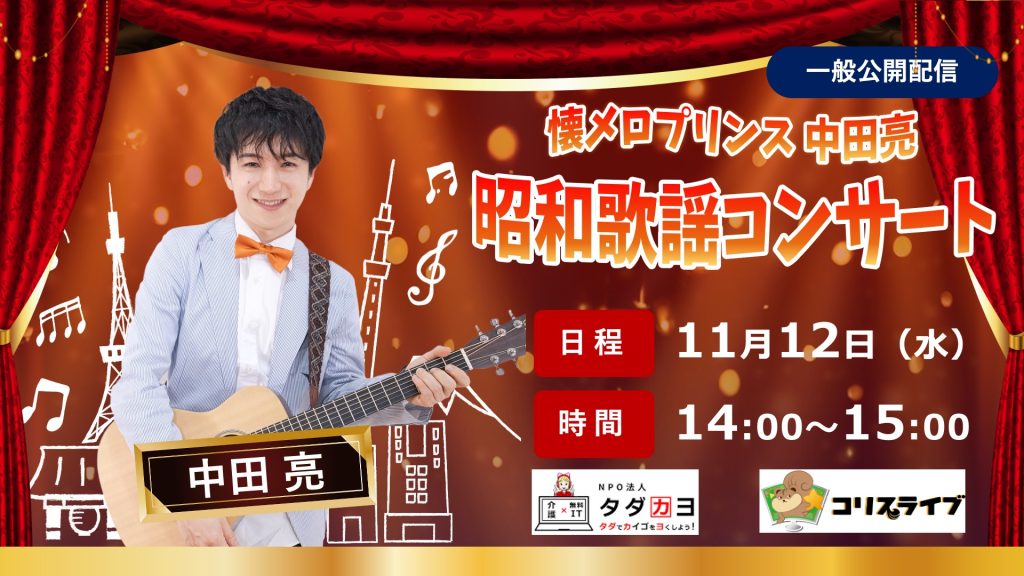 コリスライブ×タダカヨのコラボ開催の「昭和歌謡コンサート」への出演が決定いたしました!今回も参加費は無料です!下記ページよりお申し込みください! お申し込みページ -